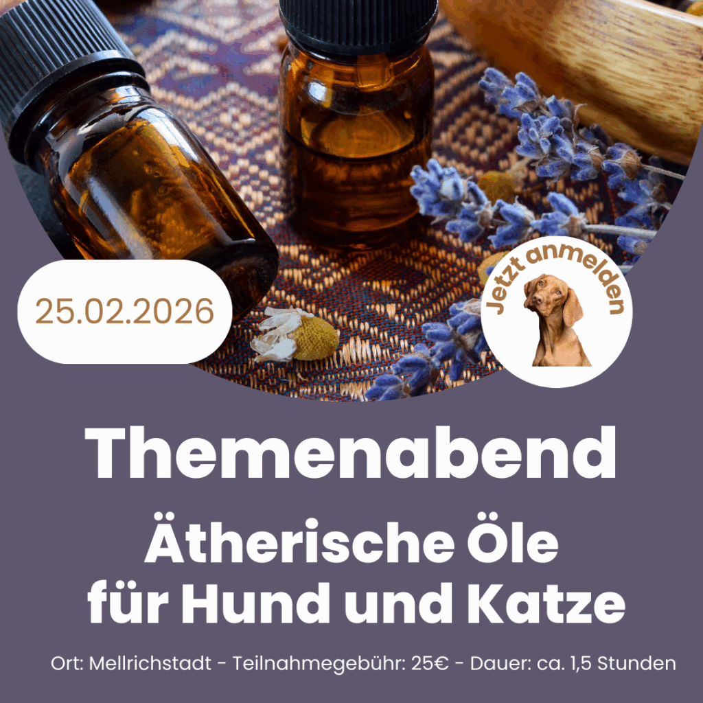 Wie wirken ätherische Öle auf unsere tierischen Begleiter? Welche Düfte sind wohltuend – und welche tabu? An diesem informativen Abend erfährst du, wie du ätherische Öle sicher und sinnvoll bei Hund und Katze einsetzen kannst. Mit vielen praktischen Tipps, duftenden Beispielen und Raum für Fragen.